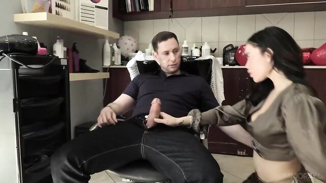 Descrição: Brad Knight knocks on the door of the new hair salon that opened and introduces himself to hair stylist Victoria June. Brad Knight sits down and tells Victoria June that he wanted a 'pussy special' as he has heard from his best friend Porno Dan that this salon offers kinky services. Victoria June suggests that Brad get a 'makeup special', and he agrees. Victoria June makes small talk and has Brad close his eyes as she applies makeup and rubs her big boobs on Brad. When Victoria June shows Brad a mirror, he is shocked that he has a rainbow and glitter all over his face. Brad cannot contain himself and tells Victoria he thought he would at least be getting a handjob as his friend Porno Dan told him the salon offered 'special services.' Victoria tells Brad she was joking around to see what he was willing to do and then pulls out his big dick and gives him a blowjob. Victoria June and Brad engage in a hardcore hookup in her hair salon, with the big booty Latina cumming multiple times on his massive cock. Brad is stunned to discover the husband of Matt Bird is watching him fuck his wife and even more shocked when he invites him to have a threesome. Make sure to watch part three, in which Brad and Matt double-team hotwife Victoria June.