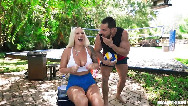 Description:Elana Bunnz can't keep her eye on the volleyball when her teammate Duncan Saint's dick is bouncing in his shorts. She gets so turned on, she takes a time-out to sneakily rub one out. When Duncan catches her rubbing her clit with her big tits out, scoring with the blonde is the only thing on his mind. They sneak off to find a quieter spot where Elana sucks his cock and he pounds her pussy. Elana wraps her big tits around his dick till he cums in her mouth for her to play with!