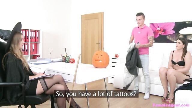 Descrição: Don and Vanny (37 mins). It was approaching Halloween so I decided to don my sexy witches outfit and decorate the office with some pumpkins. When the casting couple arrived I was a bit disappointed that they didn't even mention my outfit or the effort I'd put into the office, but I guess it's not everyone's favorite time of year. We proceeded with the interview and they seemed like an open minded married couple and I was able to convince them to do a casting for me in return of which I would give them plenty of work. They seemed a little nervous at first but she was soon on her knees stuffing her husbands cock into her mouth. I began to give them directions on what to do next, like trying the 69 position and for the husband to lick his wife’s pussy. Watching these two fuck on my couch was getting me really turned on, but married couples often don't want me to join in. So I pulled my favorite toy and sat down on the couch next to them. I told them to carry on and as I watched her ride her husbands cock, moaning with satisfaction, I slipped my dildo into my wet pussy. I was so turned on and masturbating next to this horny couple was pushing all of my buttons. I was soon contorted in ecstasy on the couch as I fucked myself to a glorious orgasm. As I sat there bathing in the glow of my orgasm, I watched them continue to fuck. They weren't a very vocal couple but they were really enjoying themselves on my couch.Then, without warning, his body went all stiff as he blew his load deep inside her tight pussy. I asked him if he had cum inside his wife’s pussy and he didn't reply, but when he pulled out two massive loads of cum came dripping out of her pussy. It was such a beautiful sight, there's nothing sweeter then a husband giving his wife a creampie for a Halloween treat.